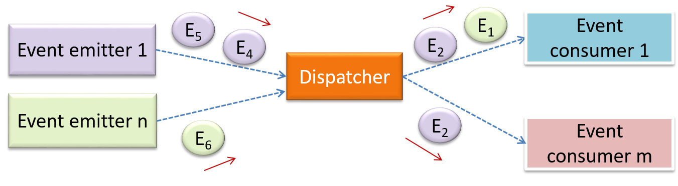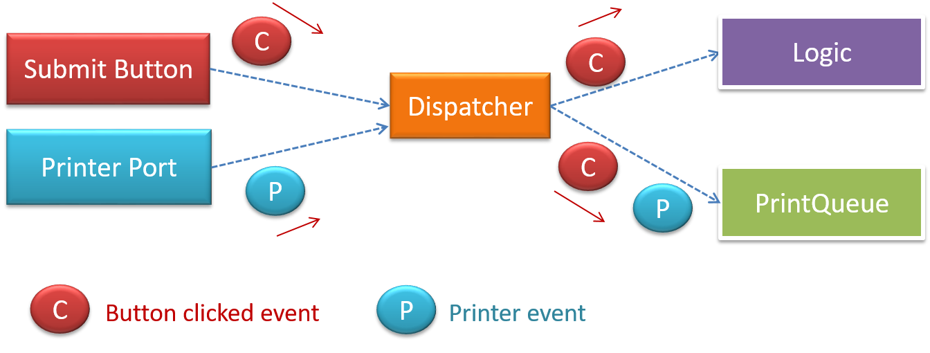 When the ‘button clicked’ event occurs in a GUI, that event can be transmitted to components that are interested in reacting to that event. Similarly, events detected at a printer port can be transmitted to components related to operating the printer. The same event can be sent to multiple consumers too.