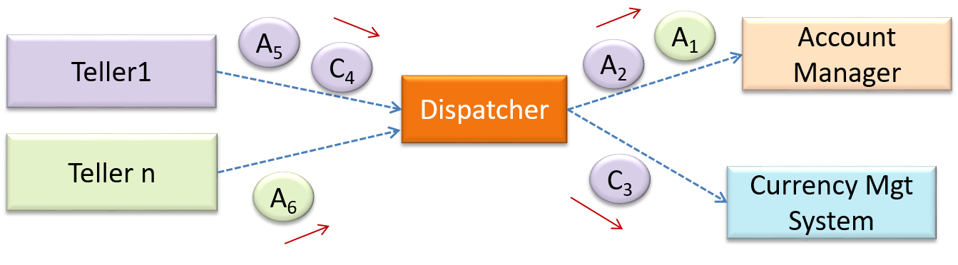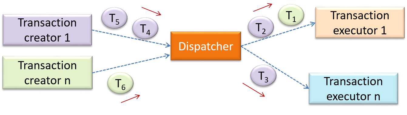 In this example from a banking system, transactions are generated by the terminals used by , which are then sent to a central dispatching unit, which in turn dispatches the transactions to various other units to execute.